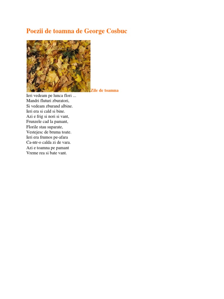 G Cosbuc Zile De Toamna Source from : https://ro.scribd.com/doc/225051495/g-Cosbuc-Zile-de-Toamna Azi e toamnă pe pământ vreme rea și bate vânt. Ieri era si cald si bine. Text of toamna de george cosbuc. Florile stau suparate, vestejesc de bruma toate. Azi e frig si nori si vant, frunzele cad la pamant, florile stau suparate, vestejesc de bruma toate.