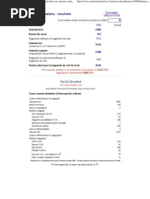 Calculatorul de salarii este avansat, așadar calculează toate taxele și impozitele pentru orice salariu brut. Conversion of monthly gross income to net wage. Calcul salariu (simulator salariu) pornind de la salariul brut (brut la net) salariul net (net la brut) sau totalul cheltuielilor suportate de angajator.