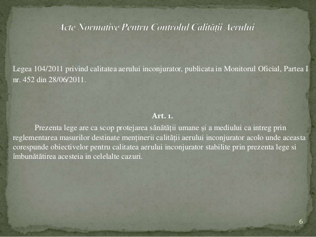 104 din 15 iunie 2011. 104 din 15 iunie 2011 privind calitatea aerului înconjurător. Legislatia din romania stipuleaza obligatii precise in sarcina agentilor economici prin legea 104/15.06.2011, lege ce are ca scop protejarea sanatatii umane si a mediului inconjurator prin luarea unor masuri obligatorii destinate mentinerii calitatii aerului.