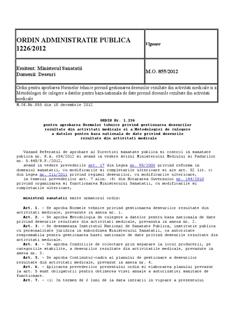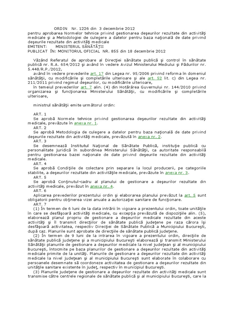 vizitati articolul complet aici : https://ro.scribd.com/doc/295509766/oap-1226-din-2012 ***defintii preluate din norma tehnica privind gestionarea deseurilor rezultate din activitati medicale, aprobata prin ordinul 1226/2012 (actul intra in vigoare la 2 alin. Gestionarea deseurilor rezuhate din activitati medicale si a metodologiei de. Autoritatea naţională de reglementare în domeniul energiei publicat în.